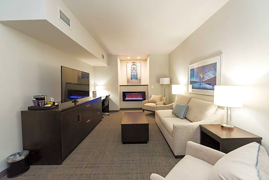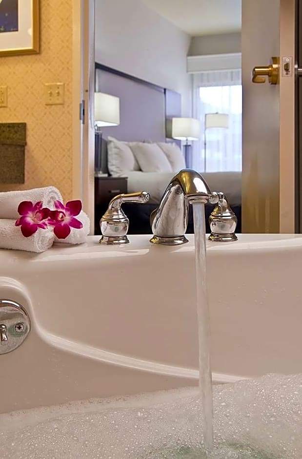 This suite features one king-bed, a chair with ottoman, and a desk, two speaker phones and two lines; dataport and voicemail. A coffee maker, iron/board, hairdryer, color television, and high speed internet access are also available. The connecting room features a whirlpool, chair with ottoman, sofa bed, coffee table, television speaker phone and two end tables.